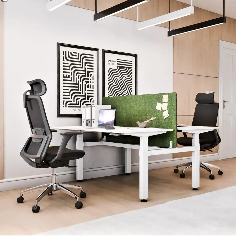 ELITE BENCH 136x140/160 to dwuosobowe biurko elektryczne z niezależną regulacją wysokości. Przemyślany wymiar pozwala na wygodną pracę bez zajmowania zbyt dużej przestrzeni. Idealne do biur, gabinetów i coworków.