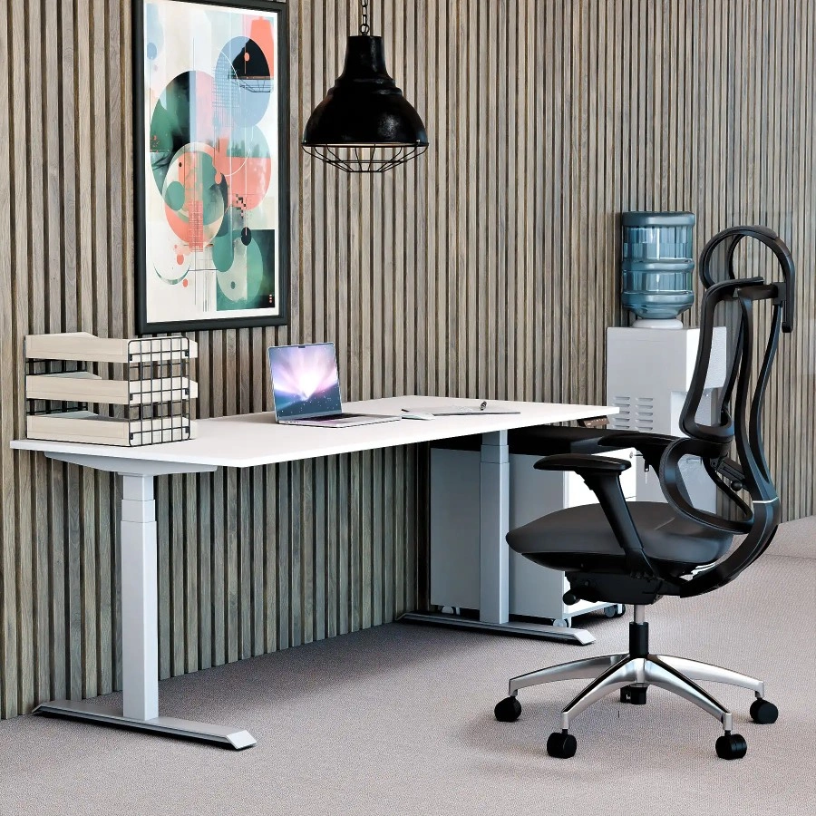 Największe biurko w linii ELITE – 180 cm szerokości, dwa silniki, regulacja wysokości i inteligentne funkcje ergonomiczne. Idealne do biur, setupów wielomonitorowych i intensywnej pracy.