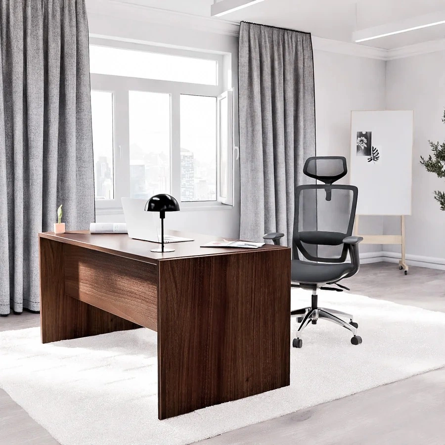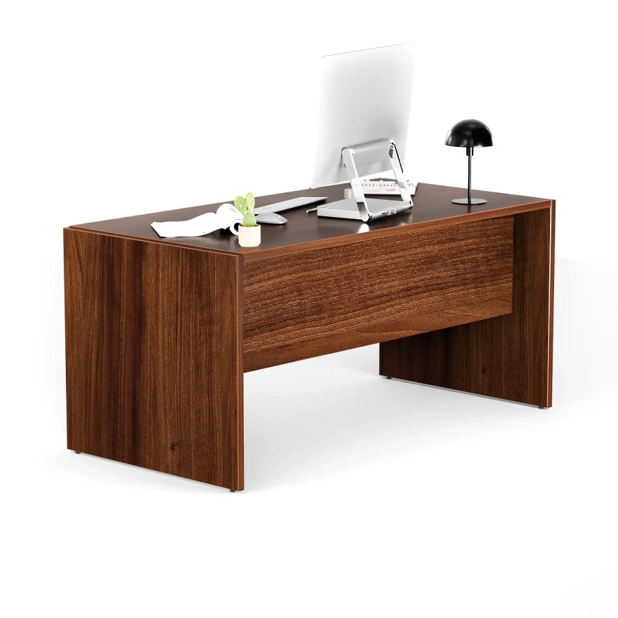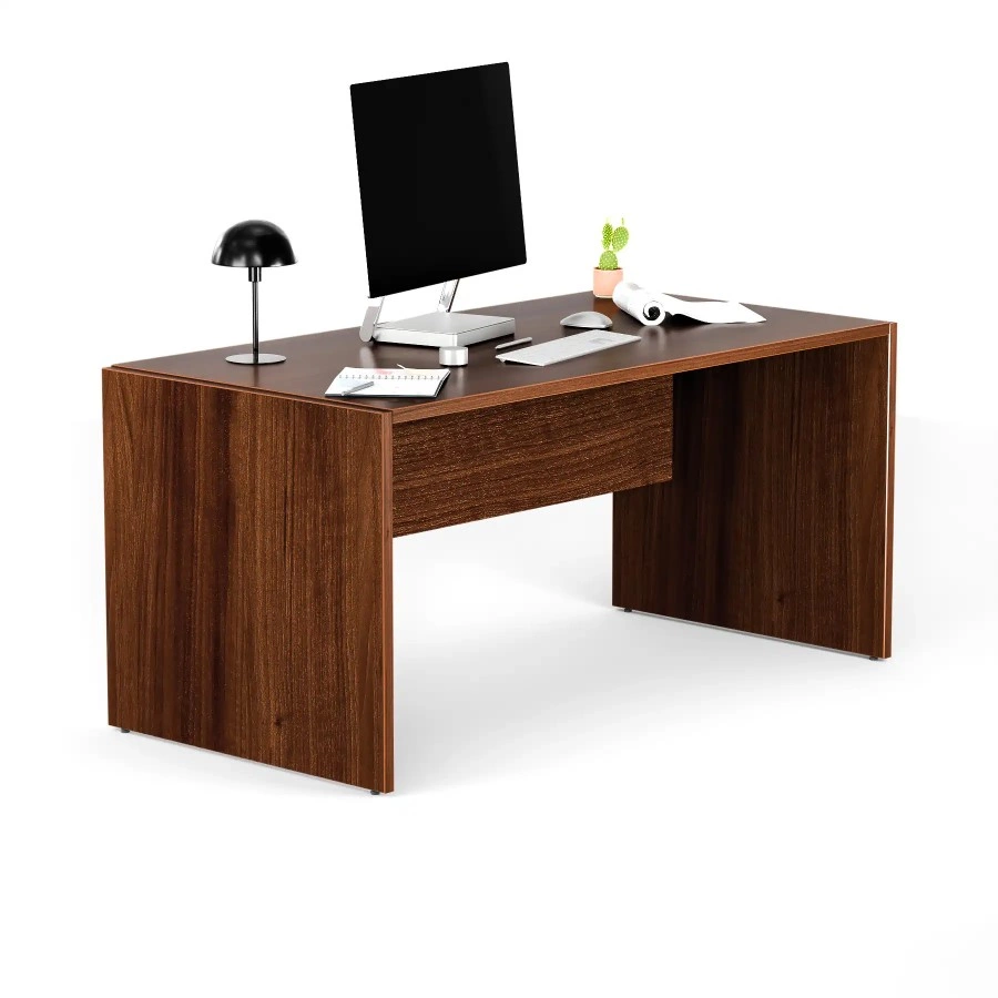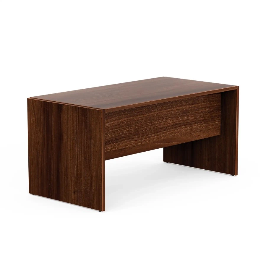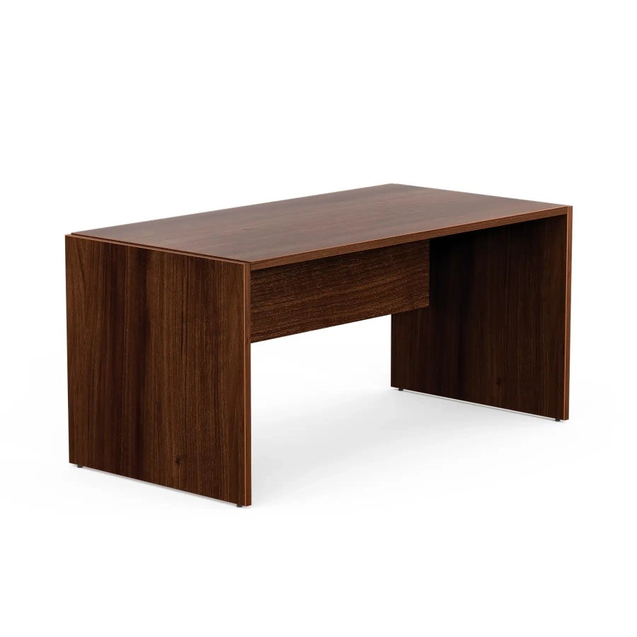 Nowoczesne biurko o płytowych nogach, idealne do gabinetu, biura lub sali konferencyjnej. Zostało wyposażone w funkcjonalną blendę, która zapewnia prywatność i komfort pracy. Stabilność na każdym podłożu gwarantują stopki poziomujące, umożliwiające precyzyjne wypoziomowanie mebla. Biurko wykonano z wysokiej jakości laminowanej płyty o delikatnie połyskującej powierzchni, która skutecznie odbija światło – co sprzyja pracy w warunkach sztucznego oświetlenia.