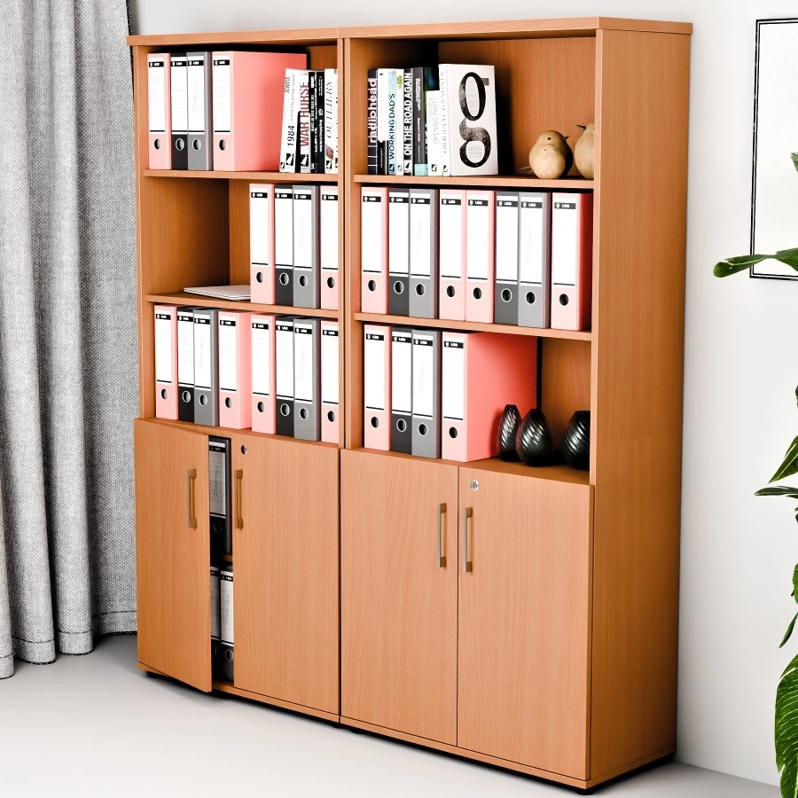Wysoka, zamykana szafa na akta z drzwiami skrzydłowymi, idealna zarówno do biur, jak i przestrzeni publicznych. Wykonana z trwałej płyty laminowanej o wysokiej jakości. Wyposażona w cztery wytrzymałe półki zabezpieczone przed przypadkowym wysunięciem. Rozmieszczenie półek zostało dostosowane do standardowej wysokości segregatorów, co ułatwia właściwe przechowywanie i porządkowanie dokumentów.