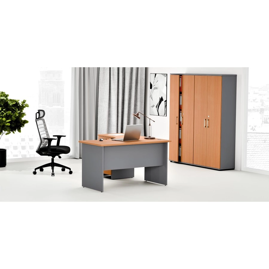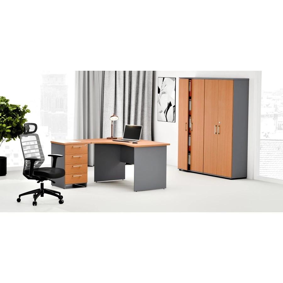 Praktyczny zestaw mebli biurowych, idealny do biur i miejsc użyteczności publicznej. Składa się z dwóch wysokich, zamykanych szaf aktowych z drzwiami skrzydłowymi, wykonanych z trwałej płyty laminowanej. Wyposażone w 4 półki dostosowane do segregatorów, zapewniają łatwą organizację dokumentów. Biurko biurowe narożne oferuje ergonomiczne rozwiązanie, a kontenerek pod biurko z pojemnymi szufladami ułatwia przechowywanie drobiazgów. Uzupełnieniem jest praktyczna przystawka, zwiększająca przestrzeń roboczą. Zestaw łączy estetykę i funkcjonalność, doskonale wpisując się w potrzeby nowoczesnych miejsc pracy.
