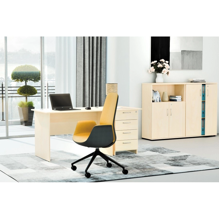 Praktyczny zestaw mebli biurowych przeznaczony do biura. W zestawie biurko o dużej powierzchni roboczej, blat wykonany z płyty o grubości 2.8 cm, obrzeże oklejone PVC 0.2cm. Pojemny kontenerek pod biurko, który pomieści przyrządy podręczne, i nie tylko. W skład zestawu wchodzą jeszcze dwie trzypoziomowe szafy biurowe, w których półki są ustawione tak, aby idealnie pomieścić segregatory z dokumentami. Cały zestaw pozwoli zmodernizować Twoje miejsce pracy!