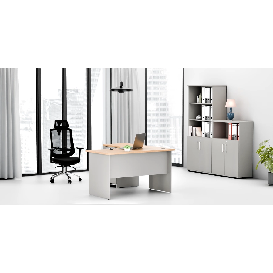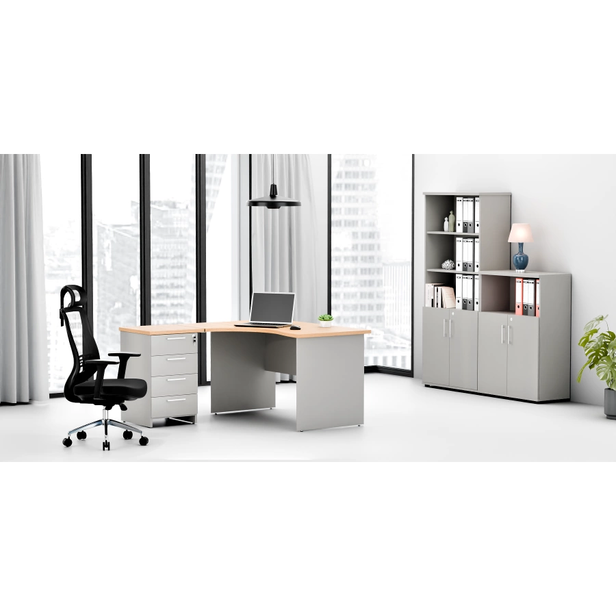 Kompletny zestaw mebli biurowych, zaprojektowany z myślą o biurach oraz przestrzeniach publicznych. Składa się z dwóch szaf biurowych z drzwiami skrzydłowymi, wykonanych z trwałej płyty laminowanej. Szafy wyposażone są w cztery/dwie półki, które pozwalają na wygodne przechowywanie segregatorów, co ułatwia porządkowanie dokumentów. Narożne biurko zapewnia komfortowe i ergonomiczne warunki pracy, a funkcjonalny kontenerek z przestronnymi szufladami umożliwia przechowywanie drobnych przedmiotów. Zestaw łączy nowoczesny wygląd z dużą funkcjonalnością, doskonale spełniając wymagania współczesnych biur.